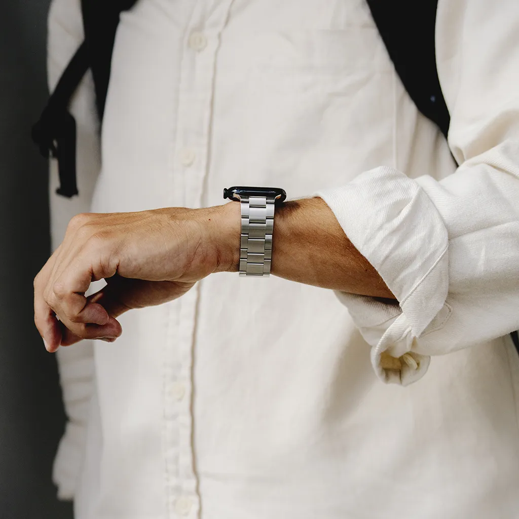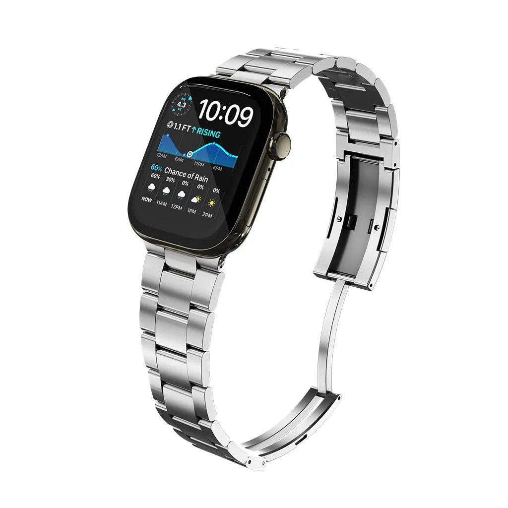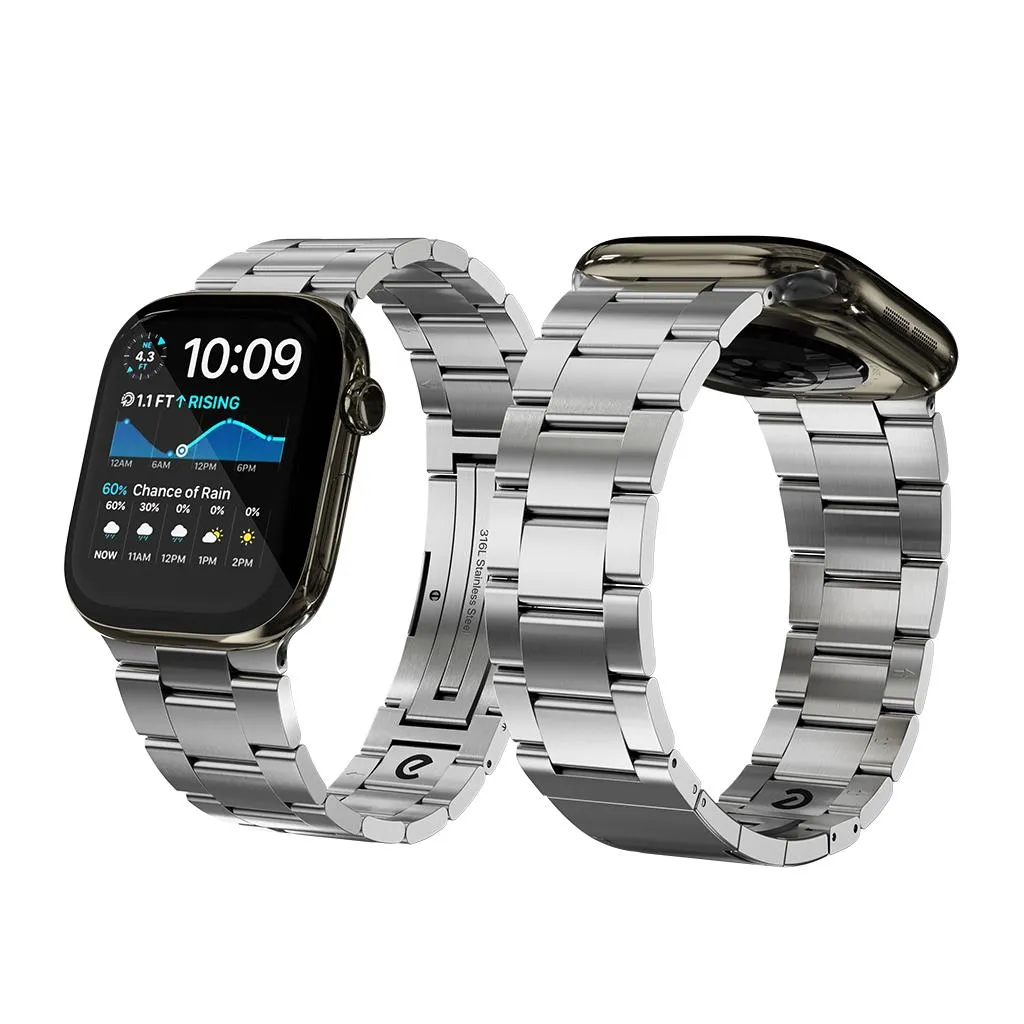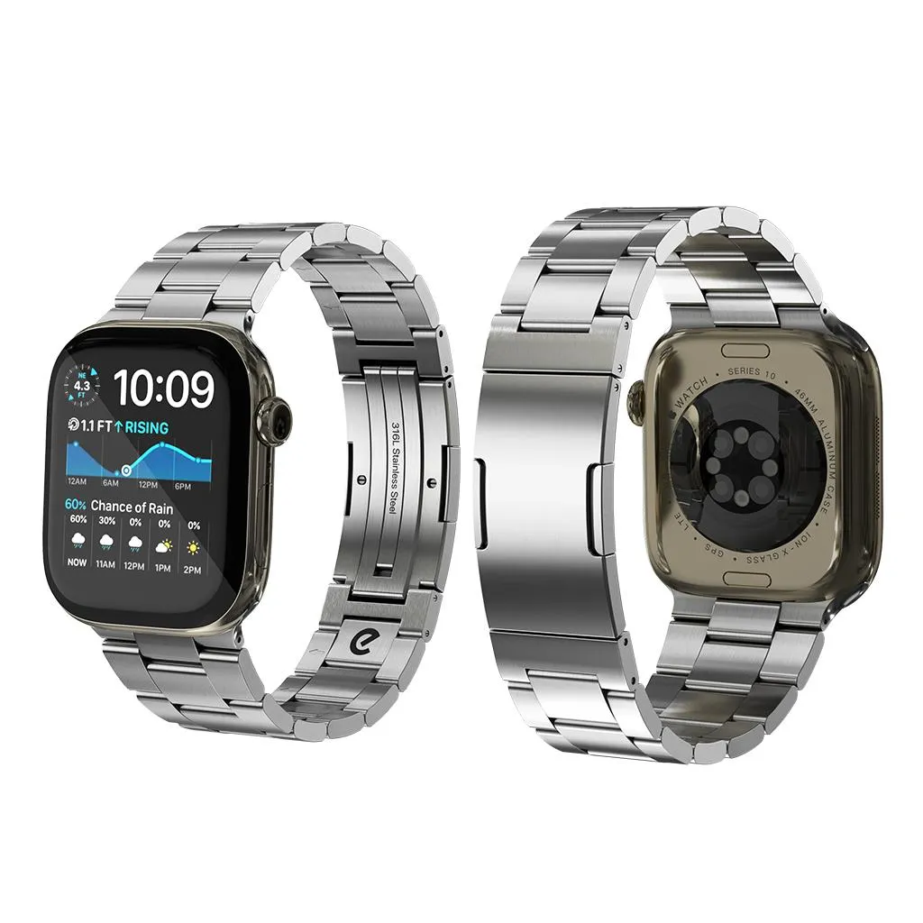 "Armband i 316L rostfritt stål med DLC-beläggning för hög slitstyrka. Ett-klicksspänne och verktygsfri storleksjustering, kompatibelt med Apple Watch 38–40 mm och 42–44 mm."