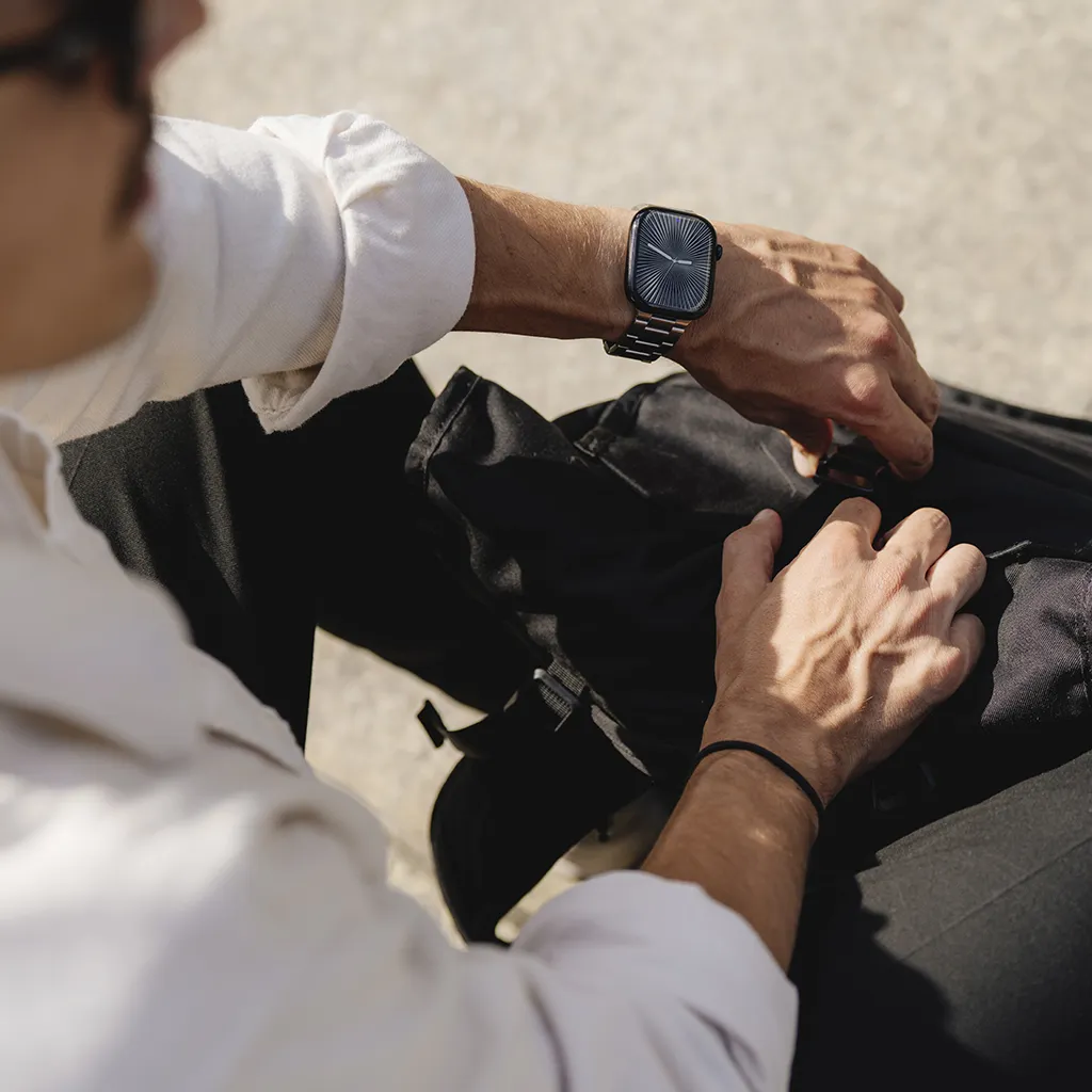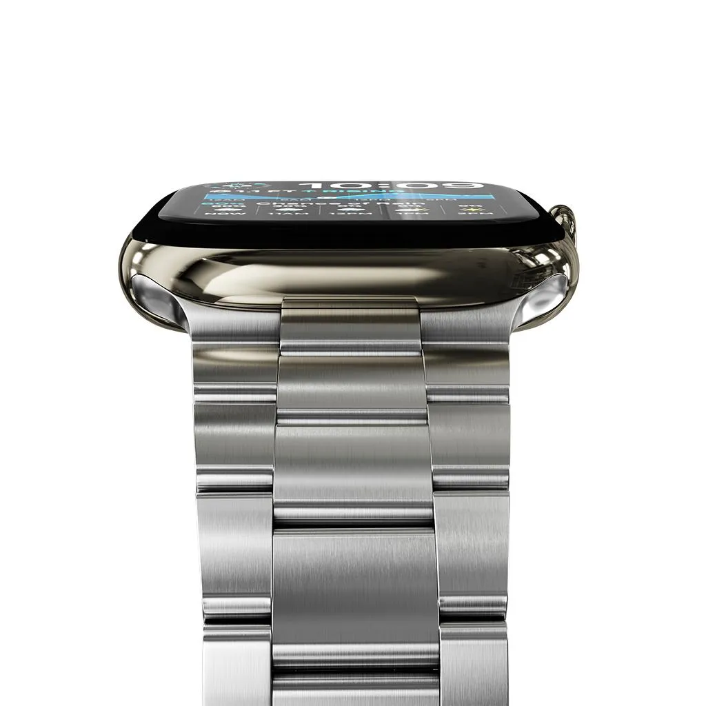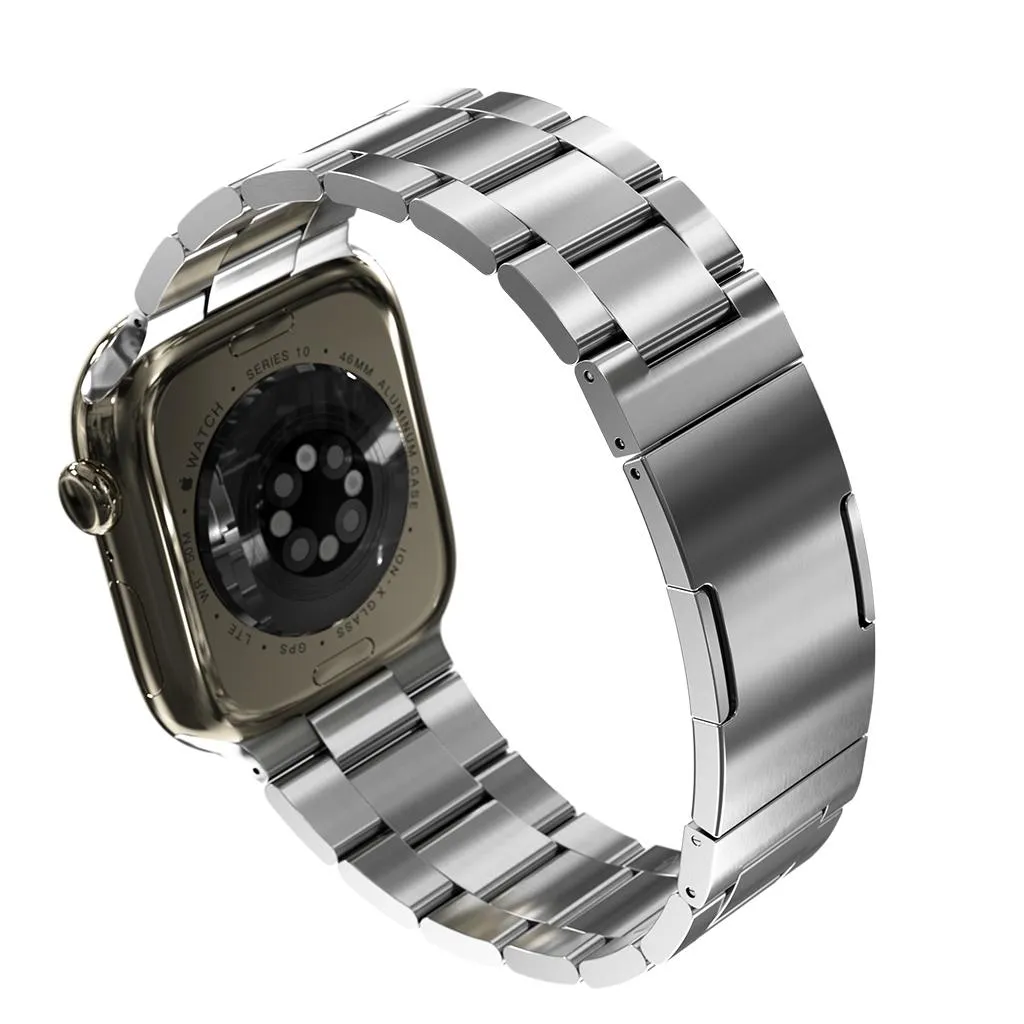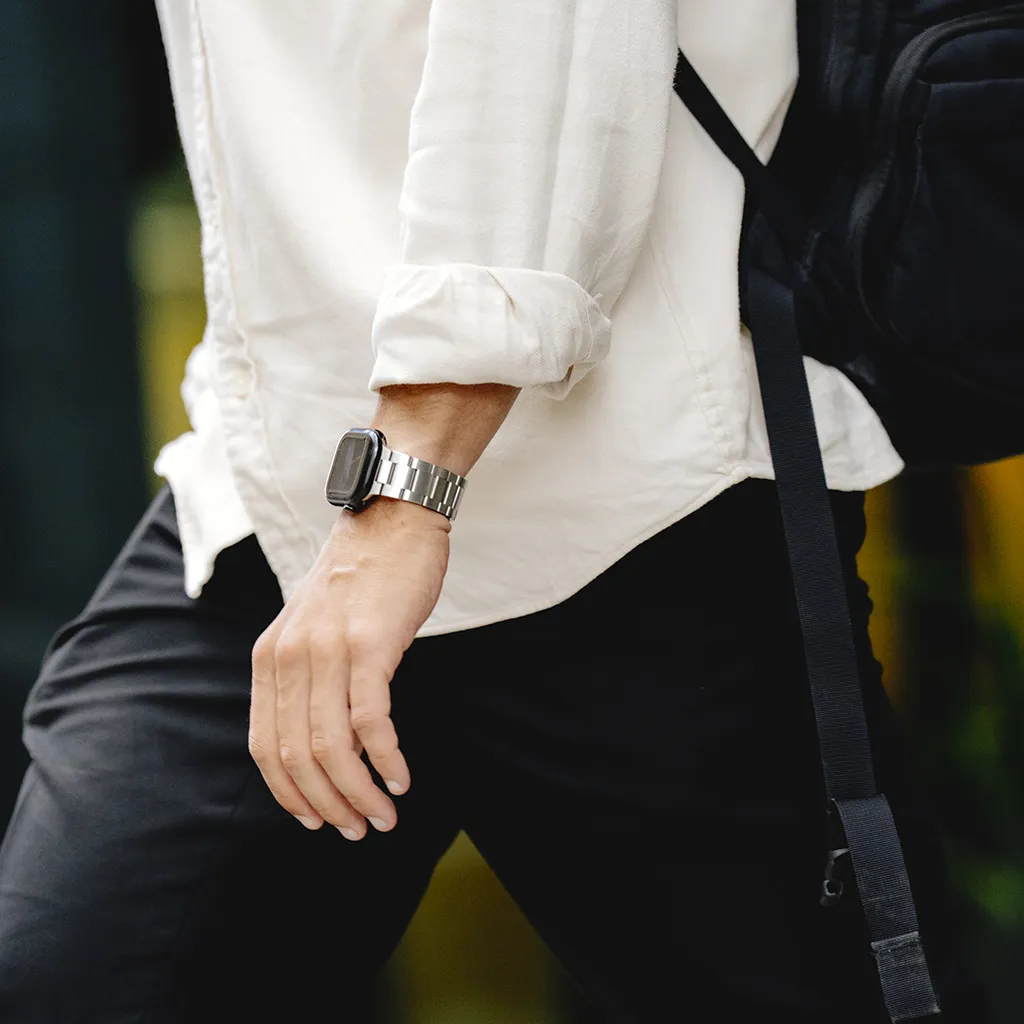 "Armband i 316L rostfritt stål med DLC-beläggning för hög slitstyrka. Ett-klicksspänne och verktygsfri storleksjustering, kompatibelt med Apple Watch 38–40 mm och 42–44 mm."