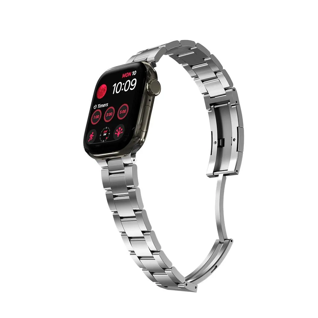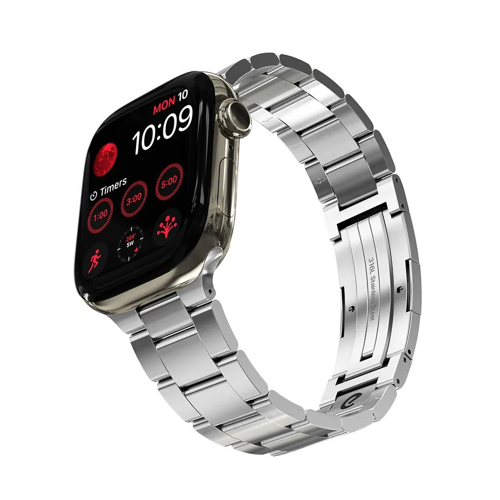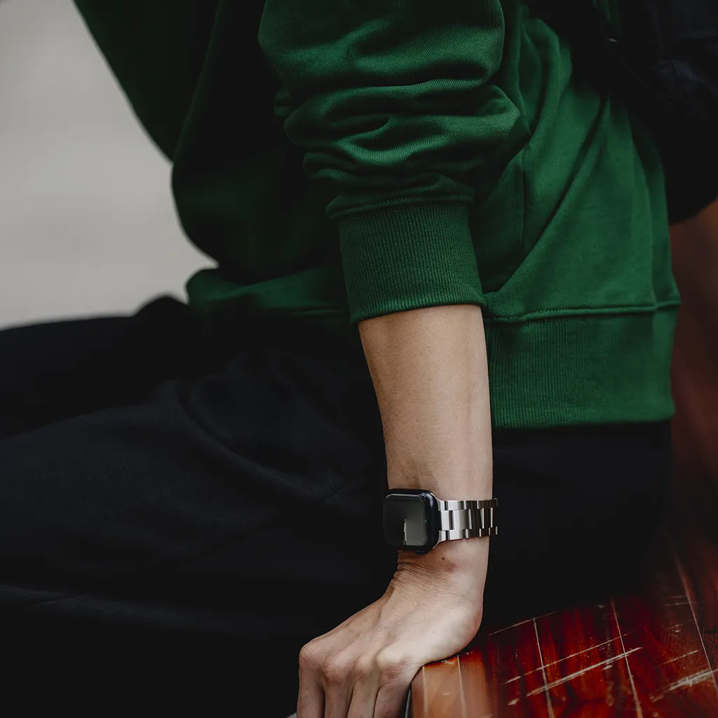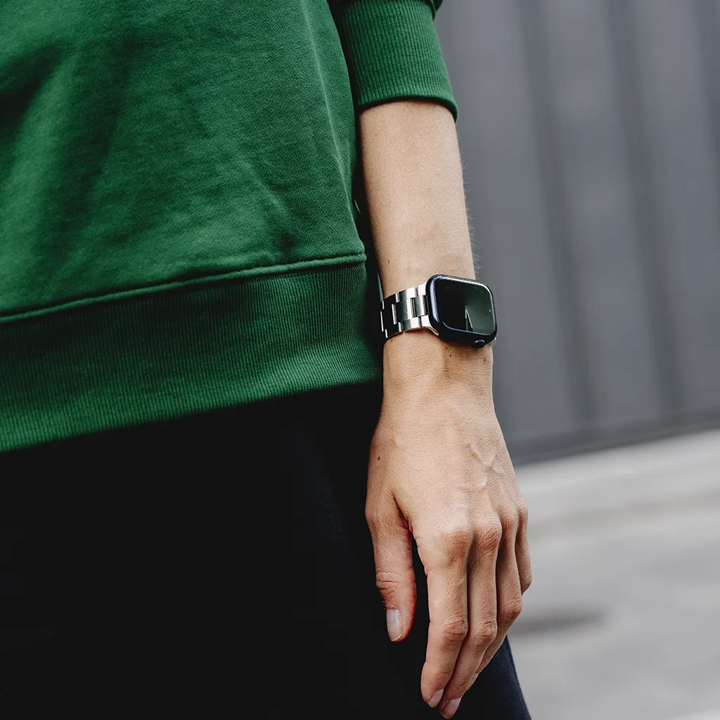 "Armband i 316L rostfritt stål med DLC-beläggning för hög slitstyrka. Ett-klicksspänne och verktygsfri storleksjustering ger säker passform för Apple Watch 38–40 mm samt 42–44 mm."