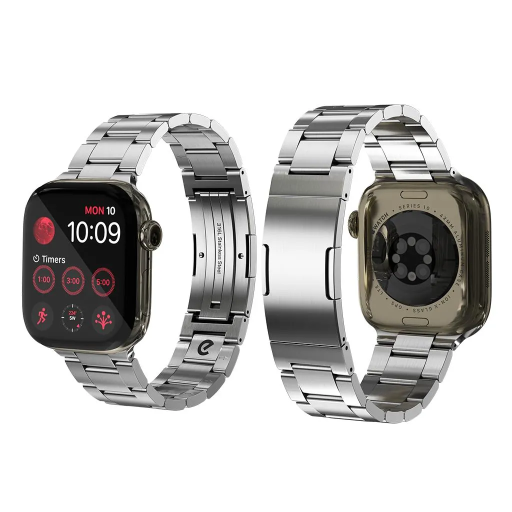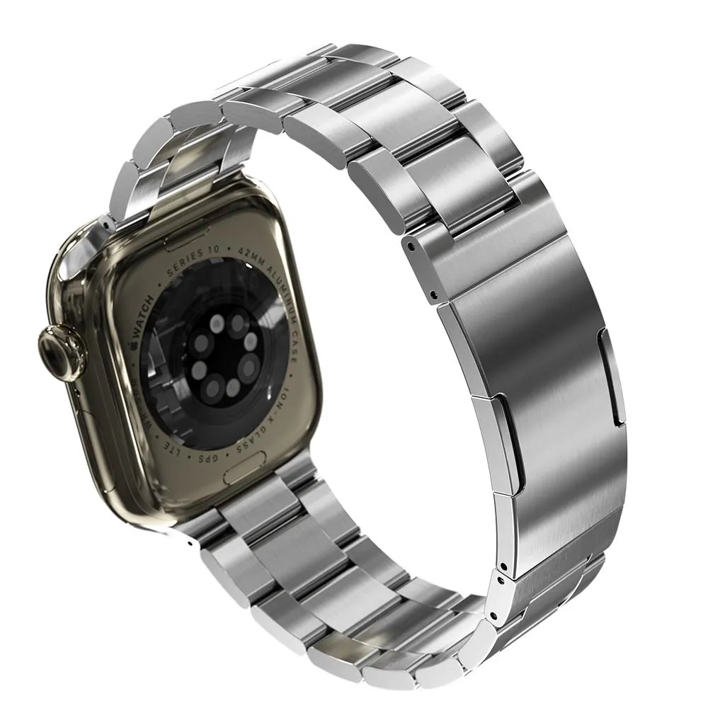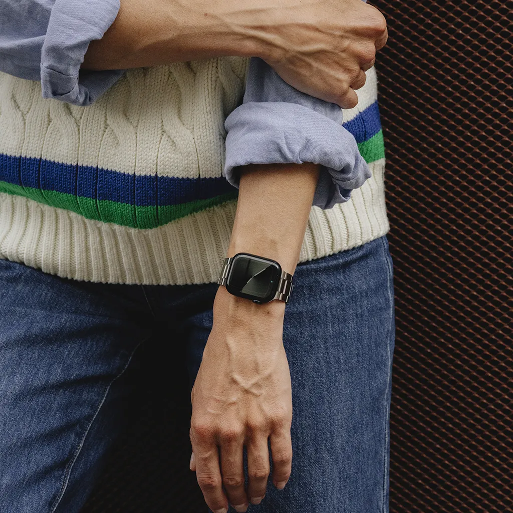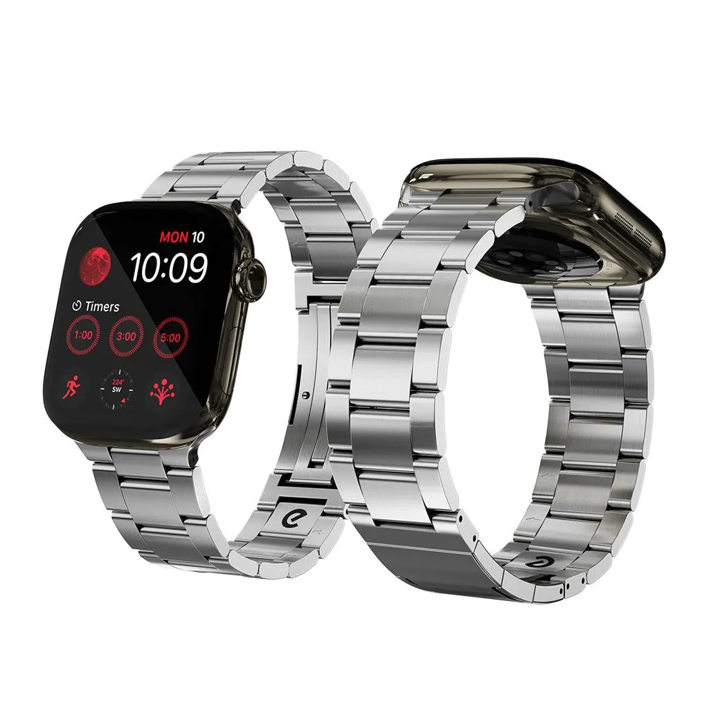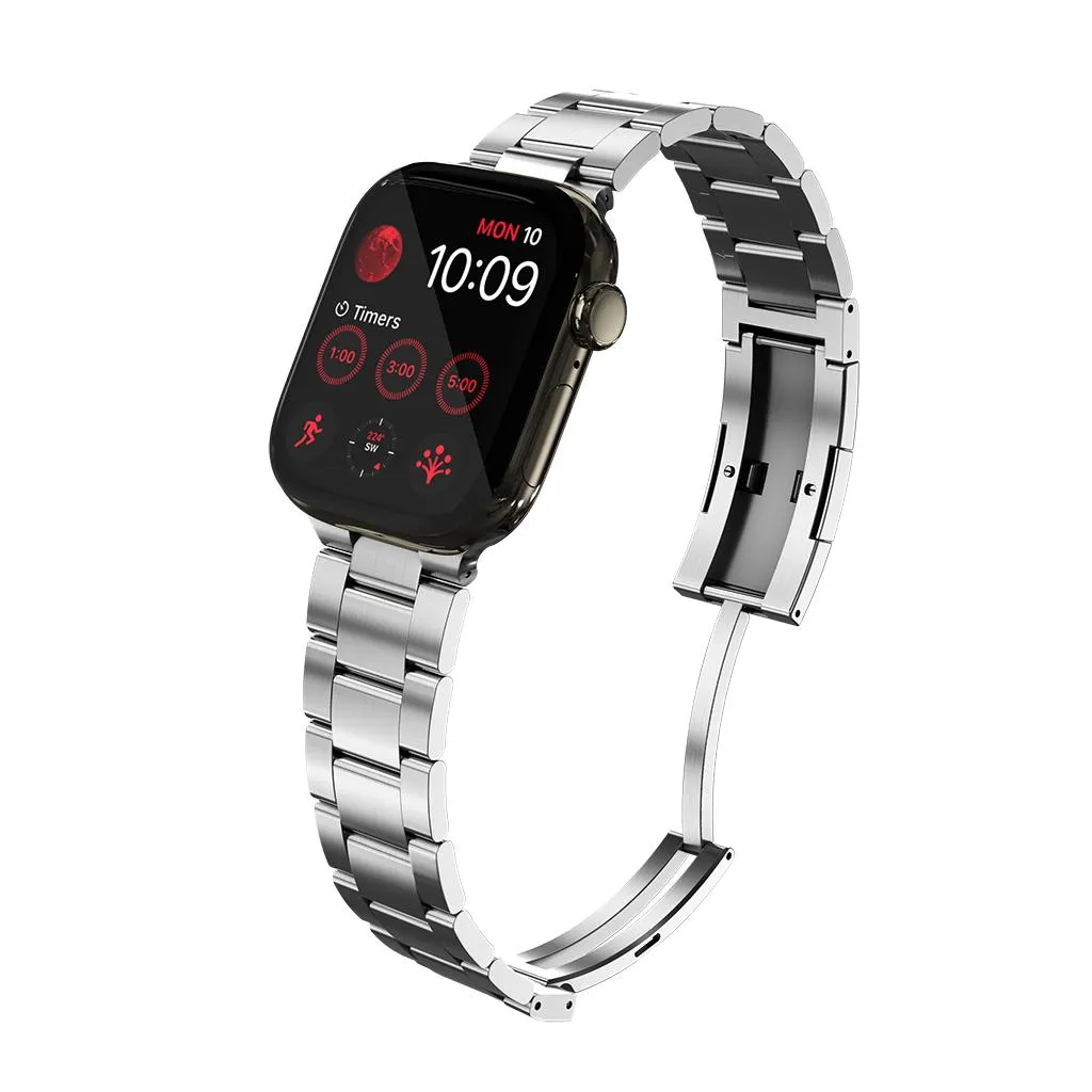 "Armband i 316L rostfritt stål med DLC-beläggning för hög slitstyrka. Ett-klicksspänne och verktygsfri storleksjustering ger säker passform för Apple Watch 38–40 mm samt 42–44 mm."