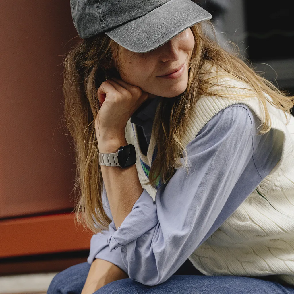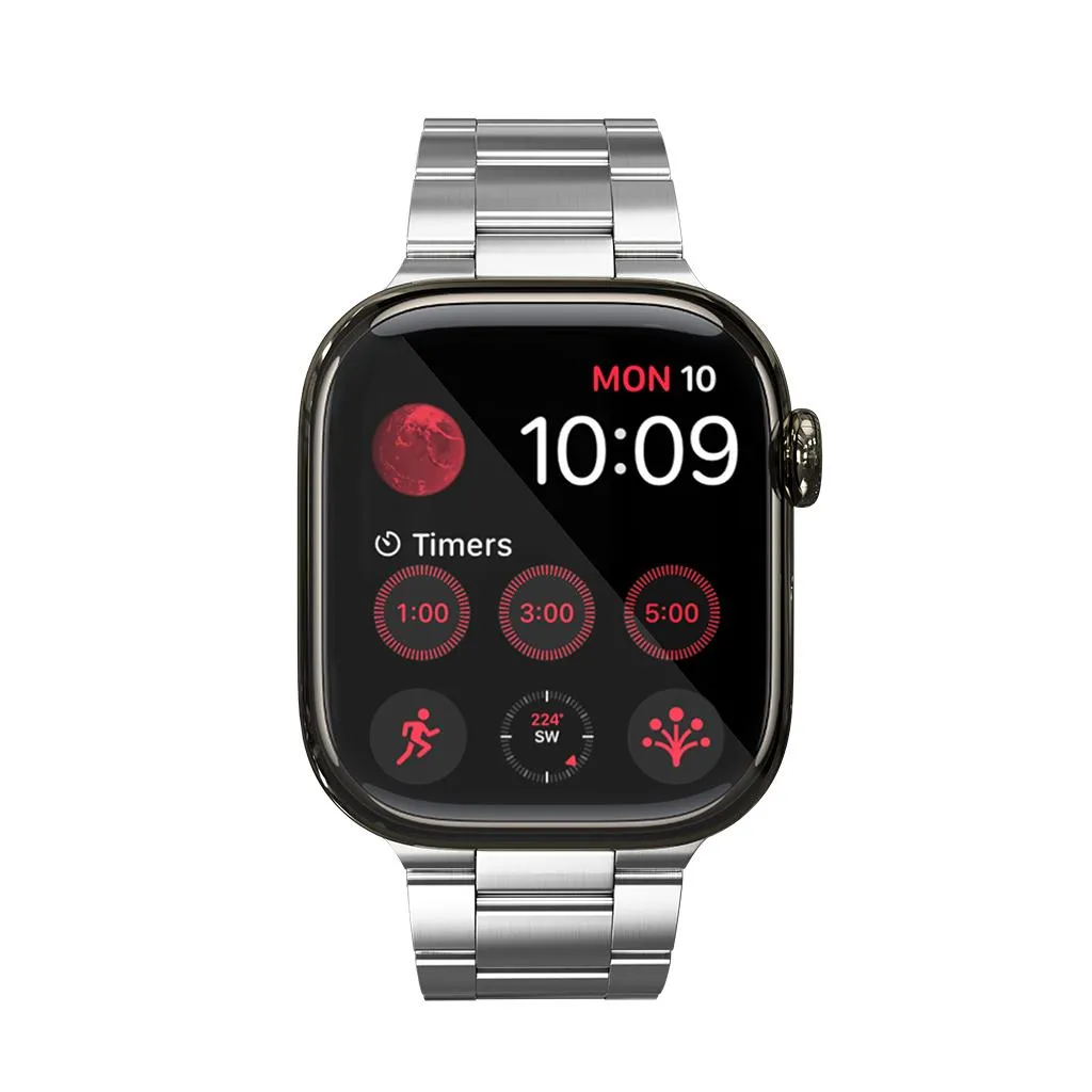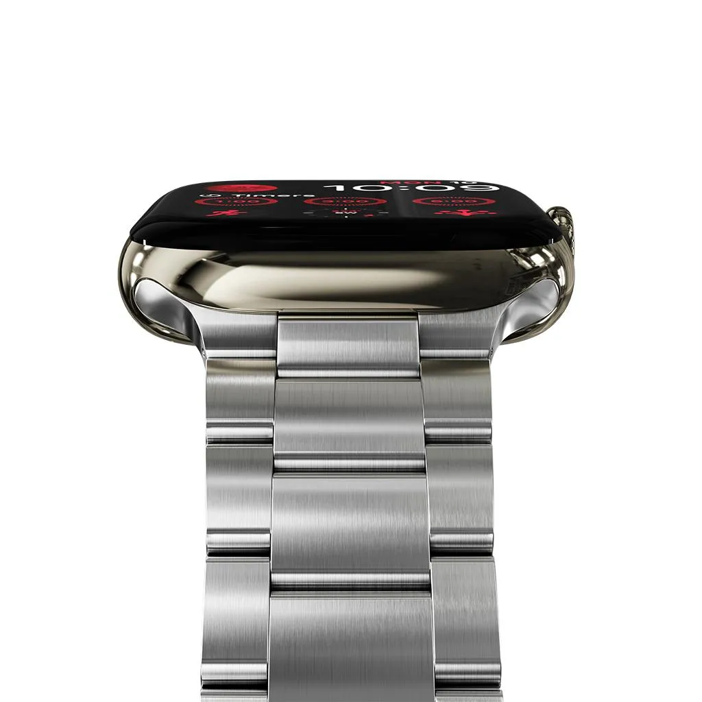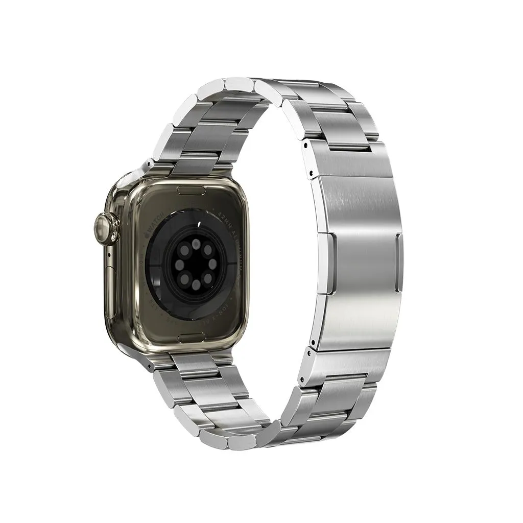 "Armband i 316L rostfritt stål med DLC-beläggning för hög slitstyrka. Ett-klicksspänne och verktygsfri storleksjustering ger säker passform för Apple Watch 38–40 mm samt 42–44 mm."