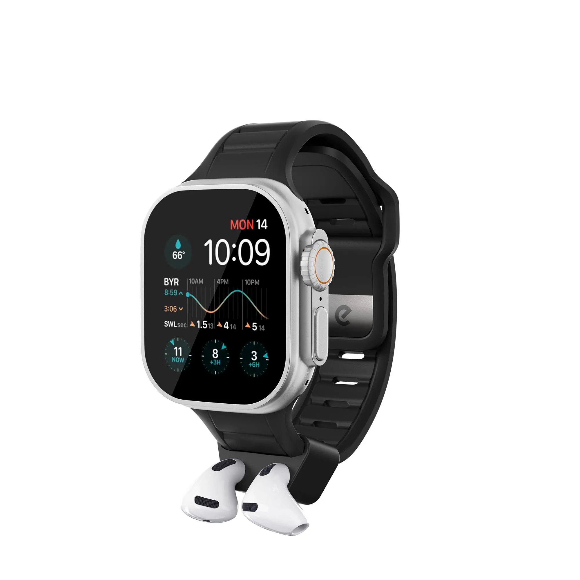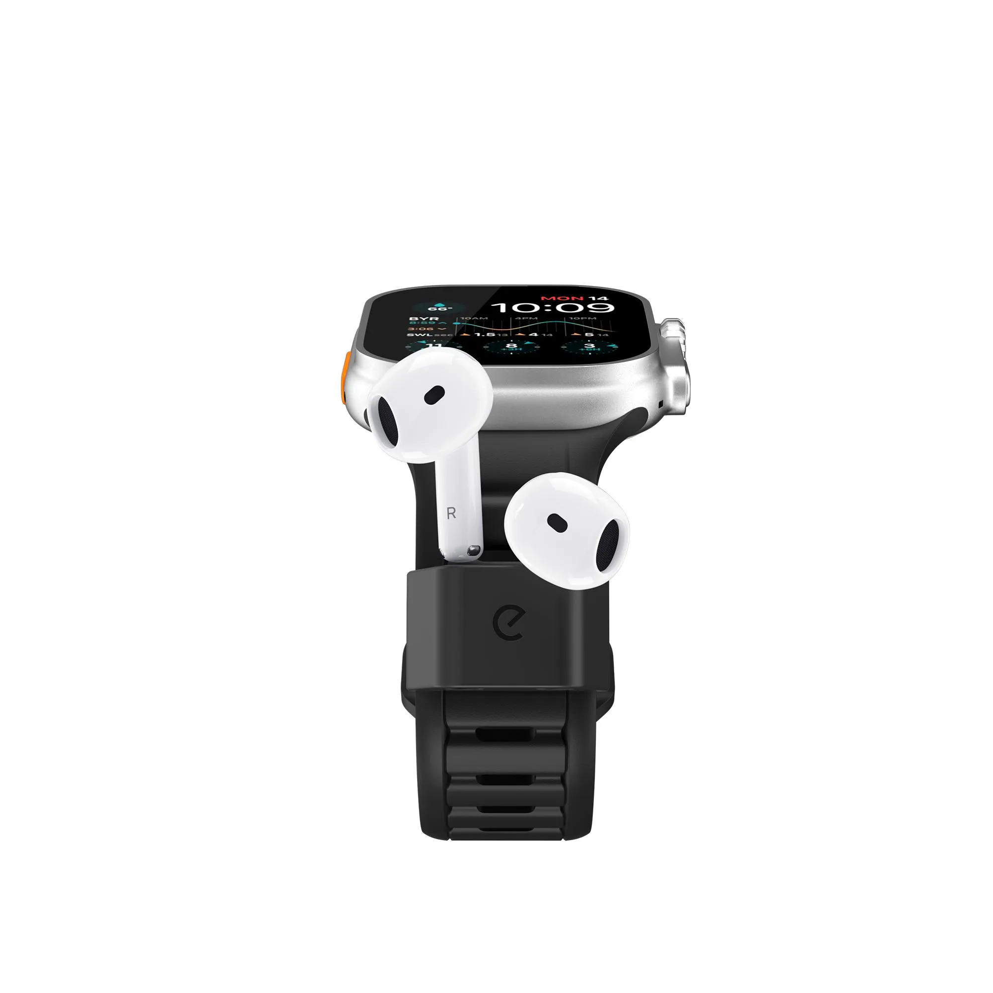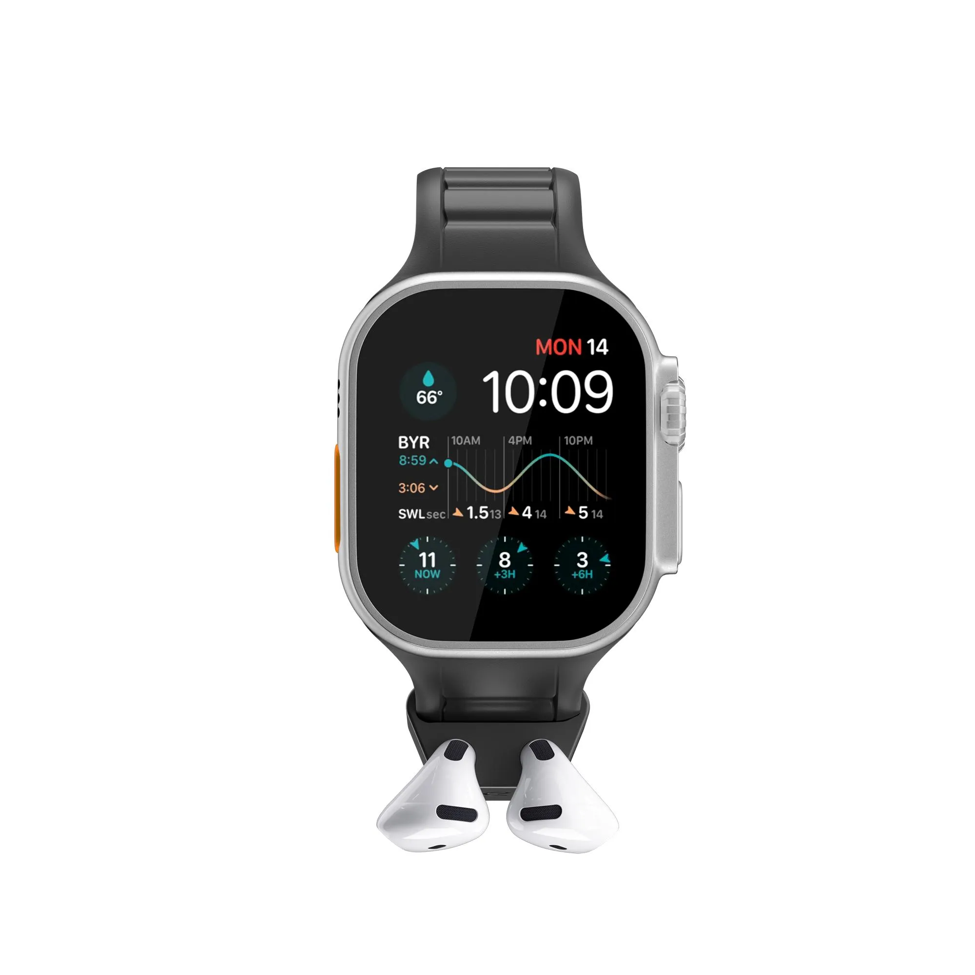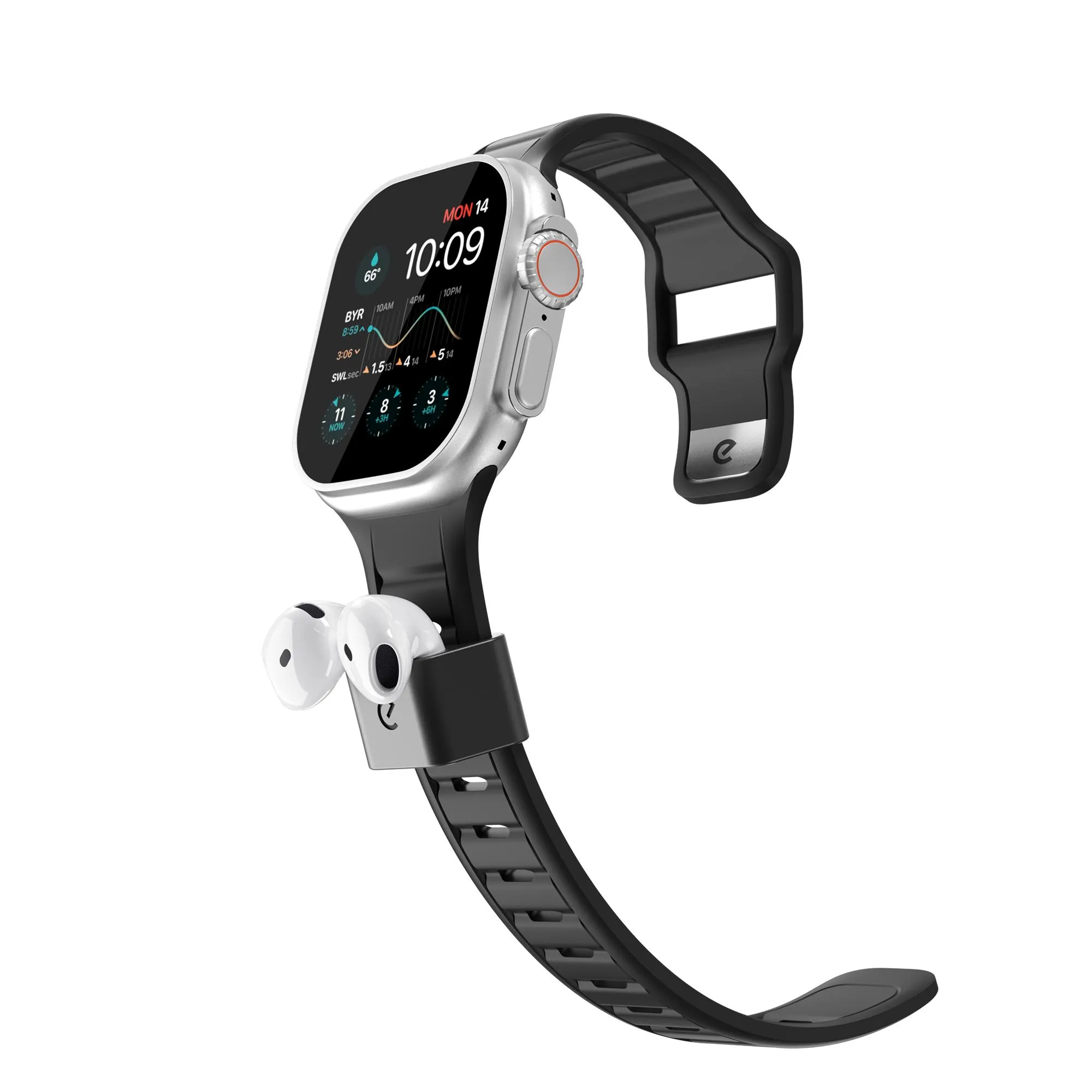 "Premiumarmband i FKM för Apple Watch 44–49 mm med en integrerad, avtagbar AirPods-docka. Vattentätt, hudvänligt och utvecklat för en säker passform med slitstark hårdvara."
