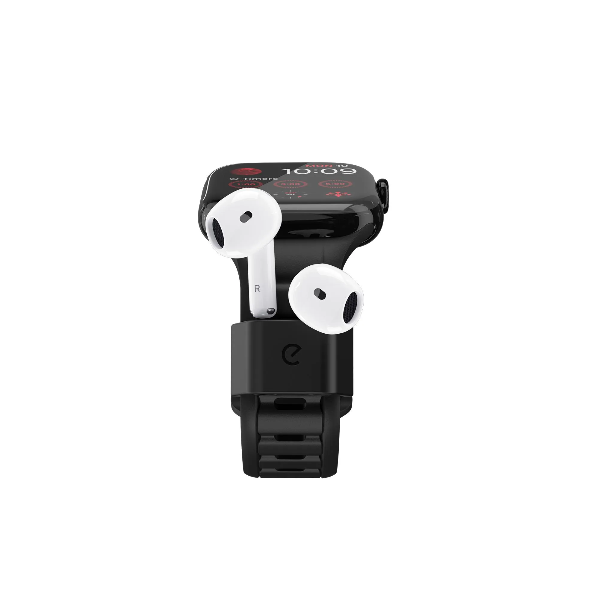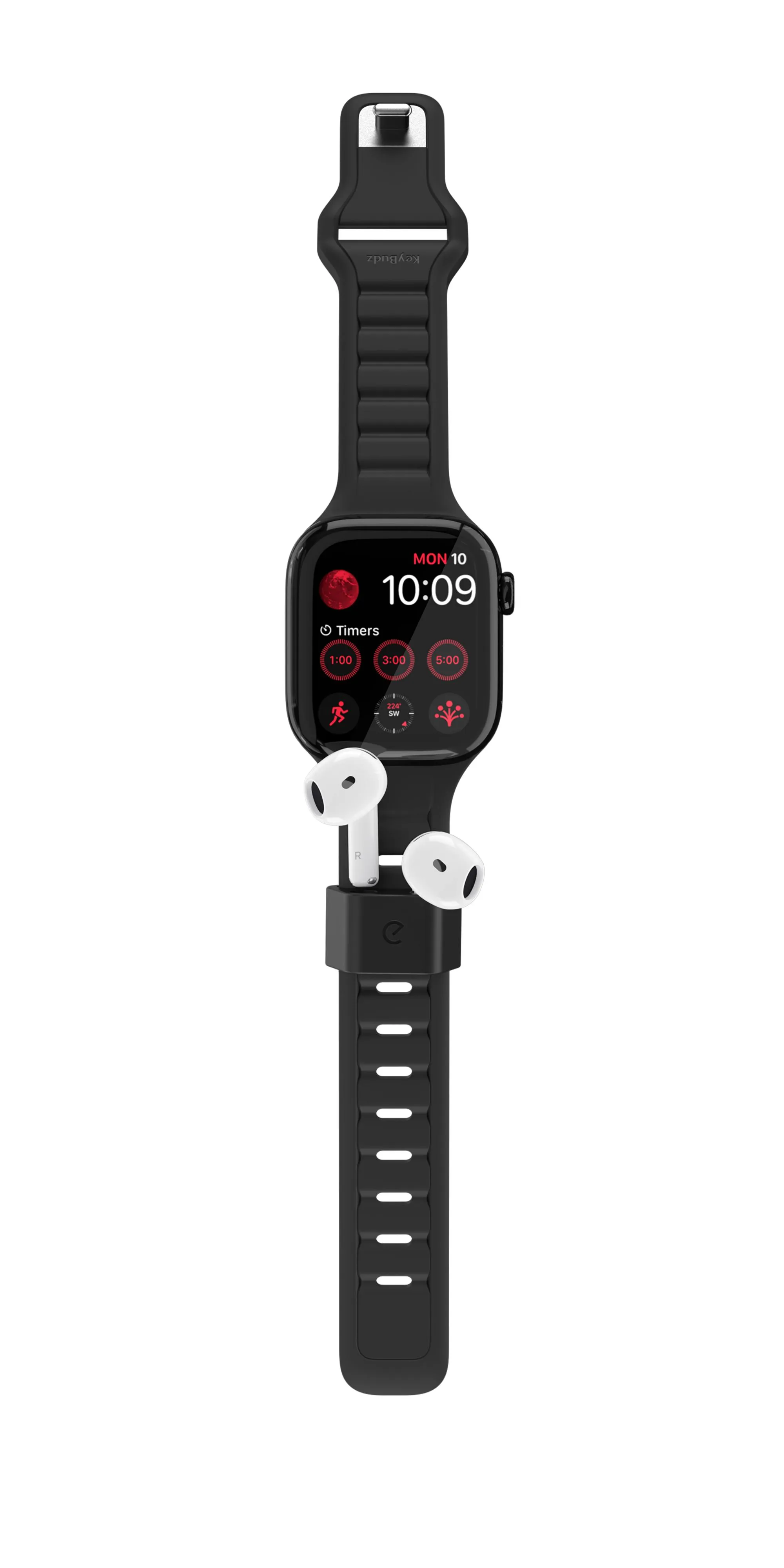 Paketet innehåller 1 Sync+ FKM Watch Strap i Carbon Black och 1 integrerad AirPods-docka.