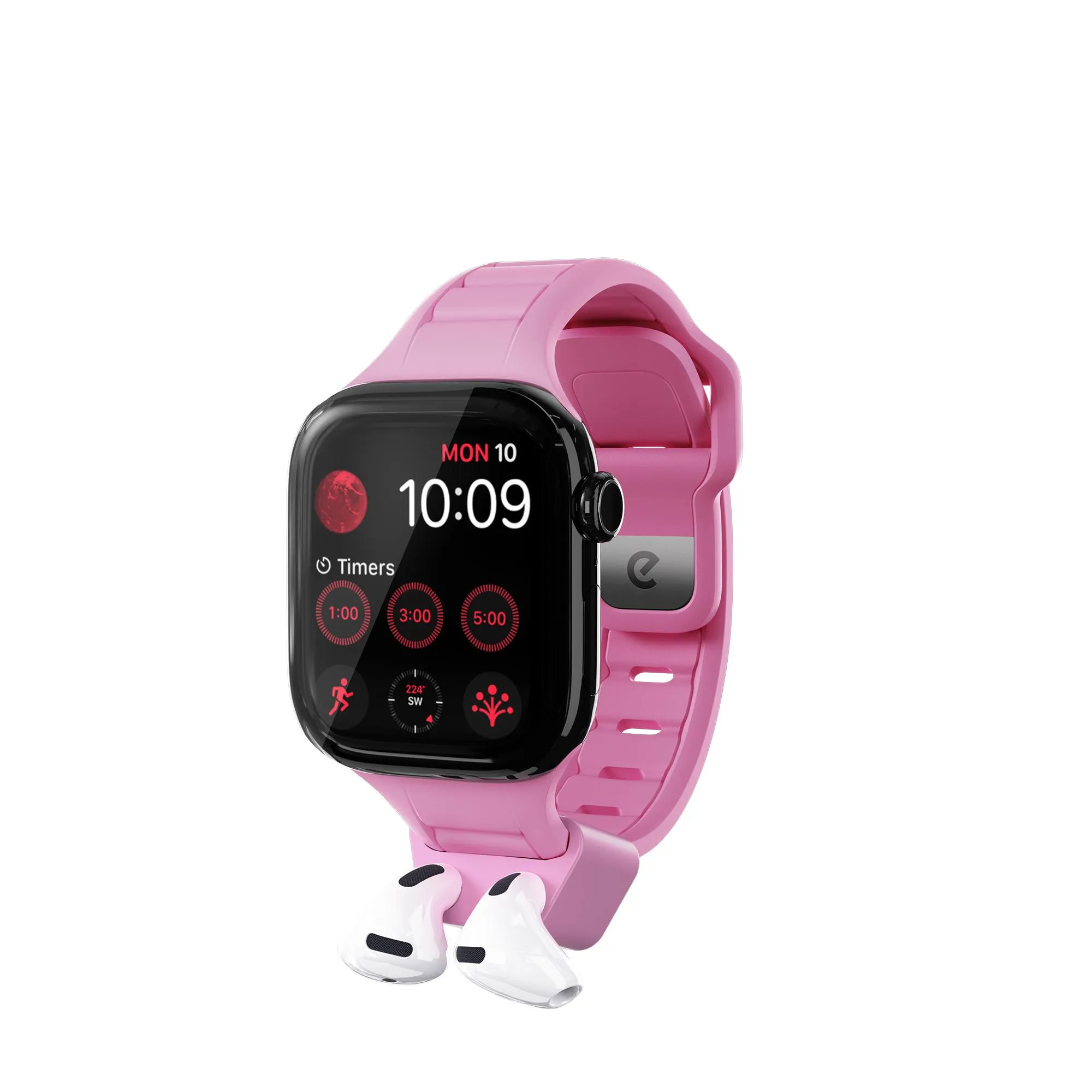 "Slitstarkt, vattentätt klockarmband i FKM med en avtagbar, handledsmonterad AirPods-docka för snabb åtkomst. Lätt aluminiumbeslag och hudvänligt silikon ger en säker och bekväm passform hela dagen för Apple Watch 38–42mm."